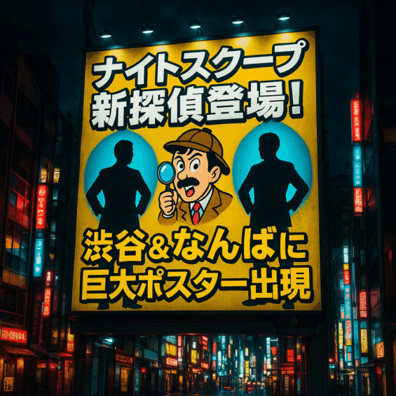 『探偵!ナイトスクープ』に新たに加わった バッテリィズ・エース と 令和ロマン・松井ケムリ。巨大ポスターでの告知は、番組の新章突入を象徴する仕掛けでした。